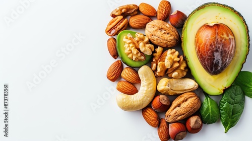 A nuts and avocados, isolated on white background, healthy food choices, cholesterol management, heart health concept.
