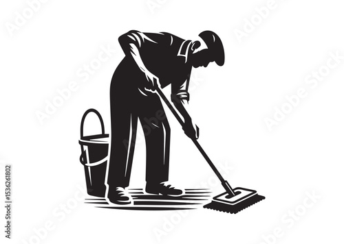 A old aged man are cleaning the floor with floor mat Silhouette Vector