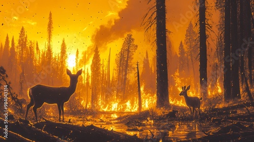 A once-lush forest reduced to ashes after a wildfire, with charred tree trunks and smoke still rising from the ground, as animals like deer and rabbits cautiously emerge from the devastation, symboliz