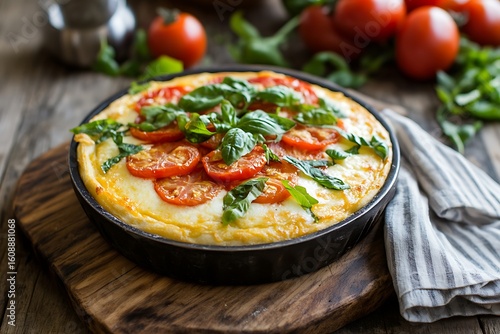 A original margarita pizza with a crispy crust, topped with fresh mozzarella, tomatoes, and basil, placed on a rustic cutting board