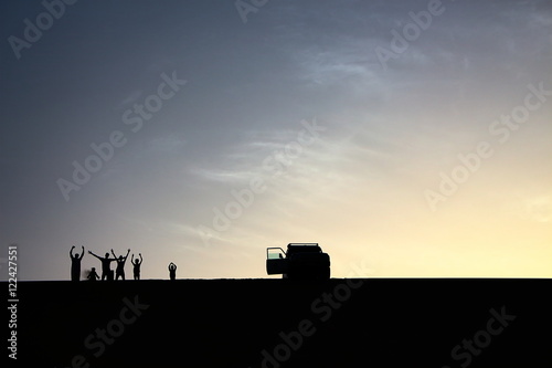 A pack of adventurers salute from the top of a grand sand dune while enjoying a beautiful summer sunset in Dakhla Oasis, Egypt.