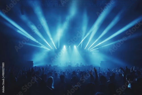 A packed concert venue with blue stage lights rock performance and silhouetted dancers at a festival