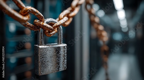 A padlock with a chain attached to it, hanging in a chain-link fence, with a blurred background of a warehouse or industrial setting.