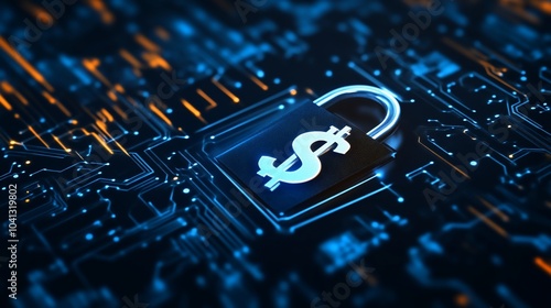 A padlock with a dollar sign on a circuit board, symbolizing financial security and online protection.
