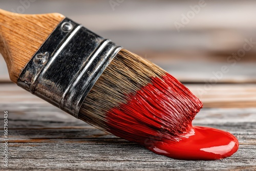 A paint brush loaded with vibrant red paint on a rustic wooden surface.
