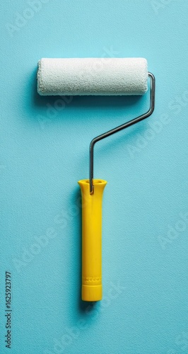A paint roller, white and fluffy, rests on a bright teal surface. The handle is a vibrant yellow
