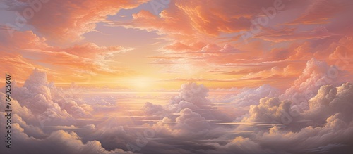 A painting capturing the beauty of a colorful sunset with fluffy clouds and a commercial airplane majestically flying through the sky