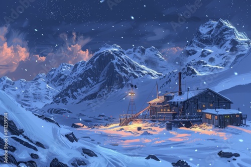 A painting depicting a snowy mountain landscape with a factory in the foreground, A heat map highlighting activity at a remote outpost in a snowy mountain range