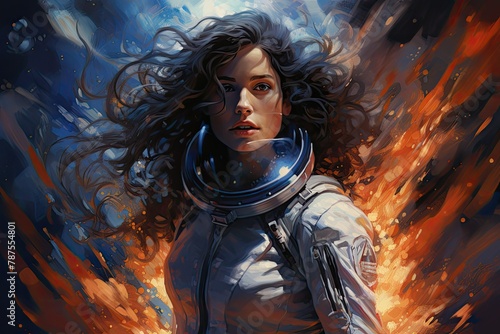 A painting depicting a woman wearing a space suit, set against a futuristic background. Generative AI