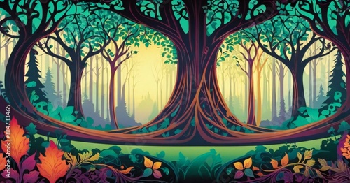 a painting of a forest with trees and a frame that says the word on it.