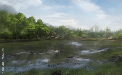 a painting of a lake next to some trees
