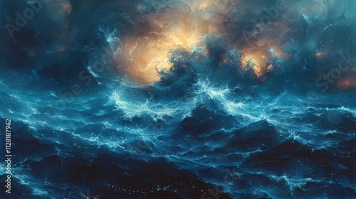 A painting of a stormy ocean with a large wave crashing