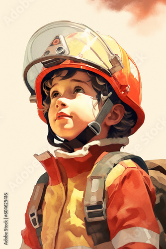 A painting of a young boy wearing a fireman's helmet. Generative AI.