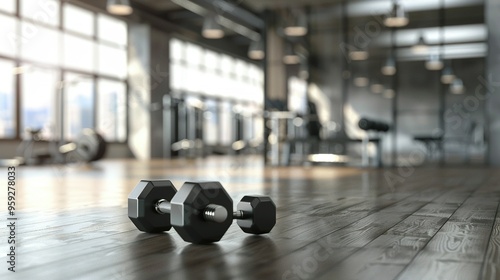 A Pair of Black Dumbbells Lying on a Wooden Floor in a Gym