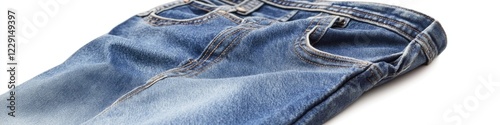 A pair of blue jeans laid out on a clean white surface