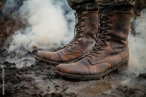 A pair of brown boots sits on top of muddy ground