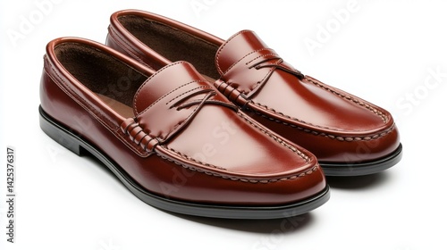 A pair of classic brown leather penny loafers are showcased against a clean white background perfect for showcasing men's formal footwear in online retail or fashion magazine.
