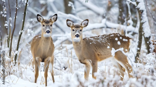 A pair of curious deer with white tails in a wintry landscape