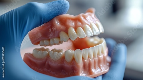 A pair of dentures is carefully held by gloved hands, illuminated by bright dental office lighting, symbolizing dental health, care, and professional orthodontics.