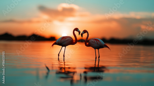 A pair of flamingos standing in shallow water during a soft sunrise, minimalist and peaceful.