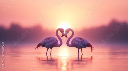 A pair of flamingos with their necks intertwined in a heart shape, standing in a tranquil lake at sunset