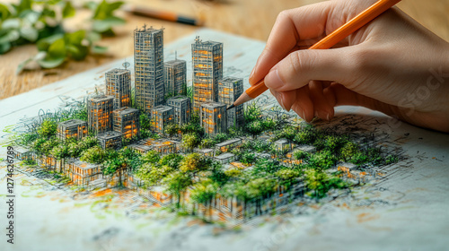 A pair of hands drawing a green city with sustainable architecture, green rooftops, and ecofriendly structures, symbolizing environmental design, vibrant colors, high detail