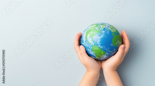 A pair of hands gently holds a small globe, symbolizing care for the Earth and global awareness.