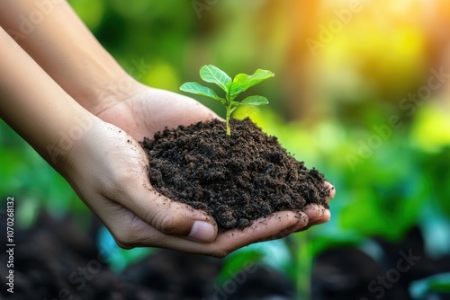 A pair of hands holding rich soil with a small green plant sprouting, symbolizing growth and environmental care.