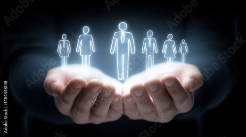 A pair of hands holds glowing digital icons of people, symbolizing leadership, protection, and human resources.