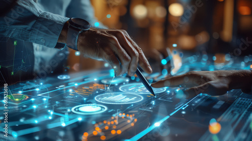 A pair of hands interacts with a futuristic holographic touchscreen display.