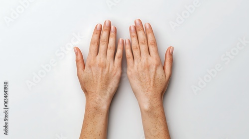 A pair of hands with visible freckles, positioned on a light background, showcasing natural skin texture and grooming.