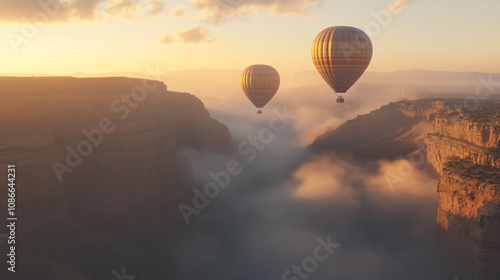 A pair of hot air balloons gliding over a foggy canyon at sunrise
