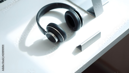 A pair of noise-canceling headphones resting next to a tablet on a minimalist white desk.