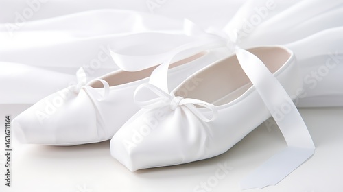 A pair of pristine white ballet shoes lying on a white background, elegantly captured with a soft-focus effect. Full frame .