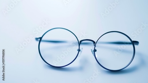 A pair of round glasses resting on a soft blue surface, emphasizing clarity and vision.