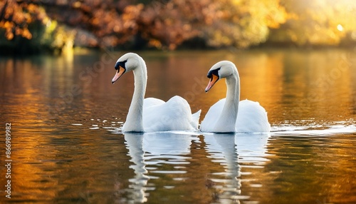A pair of swans gliding gracefully across a lake