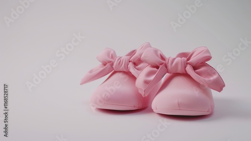 A pair of tiny pink baby shoes with soft fabric and delicate bows, placed on a clean white background.