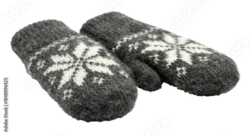 A pair of warm knitted grey mittens with snowflake patterns, transparent background