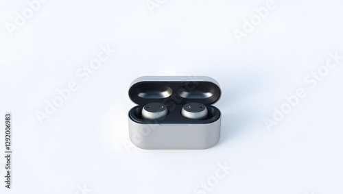 a pair of wireless earbuds resting in their charging case, showing technological innovation and convenience. It's a sleek, modern gadget