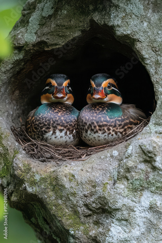A pair of wood ducks nesting in a tree hollow, feeling safe and content,