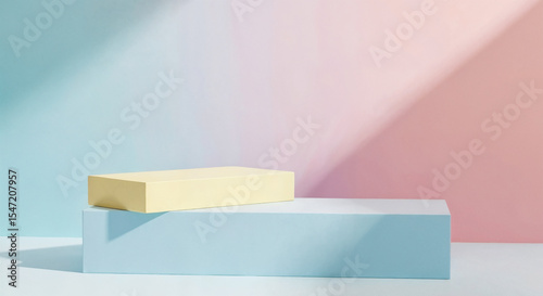 A pale yellow rectangular block sits atop a light blue rectangular block against a pastel pink and blue background