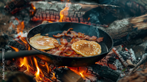 A pan of pancakes and bacon sizzles over an open fire in a camping style setting, with wooden logs burning in the background.
