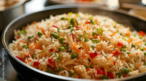 A pan of vibrant vegetable fried rice, mixed with colorful peas, carrots, and red bell peppers.