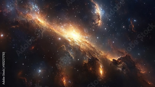 A panorama of a galaxy with bright star formations, swirling cosmic dust, and vibrant nebulae, set against the deep, dark sky.