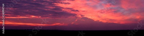 A panorama of dramatic purple pink and orange sunset with wispy clouds.