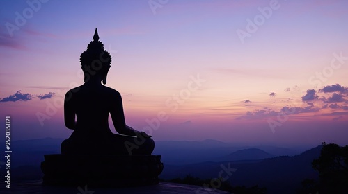 A panoramic view of a Buddha silhouette on a hilltop during twilight, with soft, ambient light creating a serene