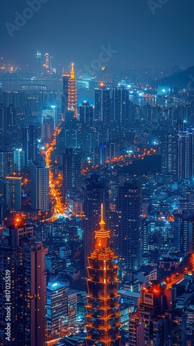A panoramic view of a city skyline with beer bottle shaped buildings lighting up for International Beer Day