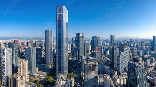 A panoramic view of a modern city skyline filled with tall skyscrapers under a clear blue sky.