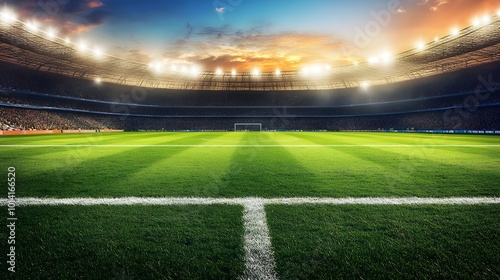 A panoramic view of an empty soccer stadium at night, with spotlights illuminating the green field and the stands, ready for a thrilling game.