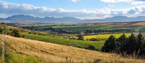 A panoramic view of rolling hills, lush green fields, and a distant mountain range under a partly cloudy sky.